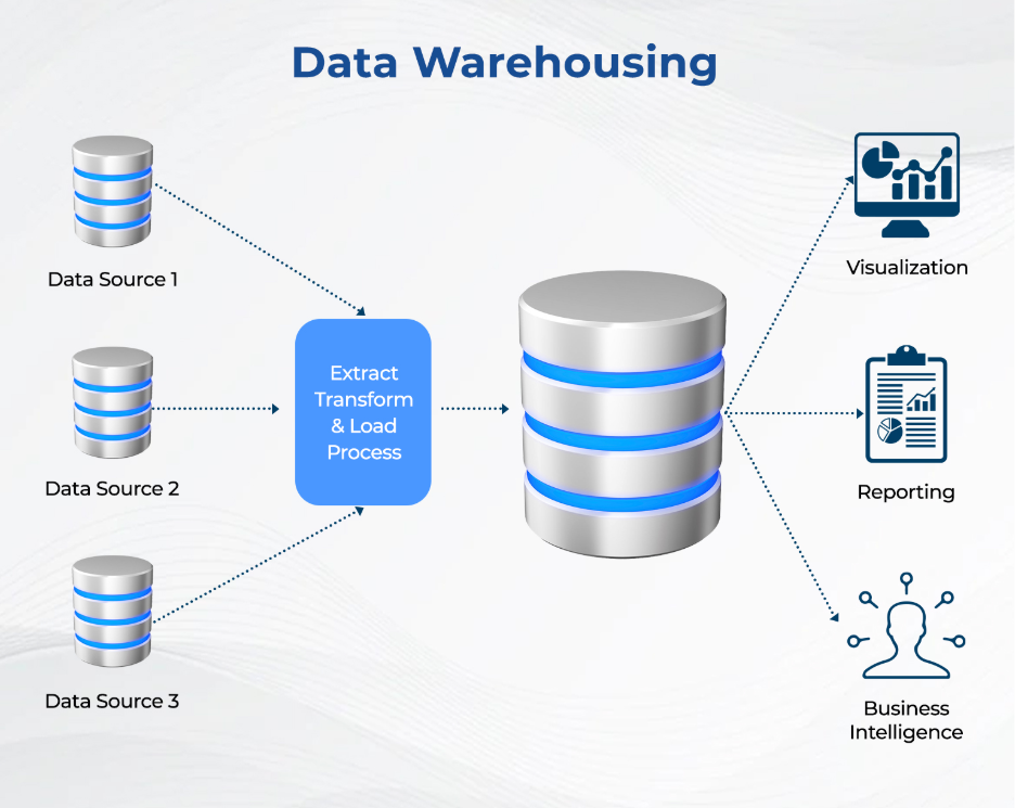 Data Warehouse adalah database terpisah yang dioptimalkan untuk query dan analisis (OLAP – Online Analytical Processing). Skemanya didesain untuk query yang cepat dan agregasi data besar.