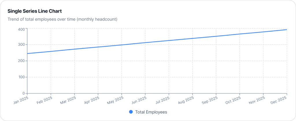 Single Line chart digambarkan dengan hanya 1 garis seri data yang menunjukkan 1 seri data di sepanjang waktu. Visualisasi ini diperuntukkan untuk melihat tren secara tunggal seperti naik, turun, atau datar/stabil. Ini juga cocok untuk menggambarkan data penjualan harian, jumlah kunjungan, jumlah order, dan jumlah stok masuk/keluar.