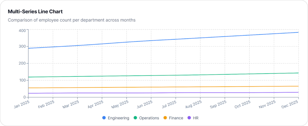 Multi Line chart digambarkan dengan beberapa garis seri data di sepanjang waktu. Setiap garis merepresentasikan kategori atau grup yang berbeda. Visualisasi ini diperuntukkan untuk membandingkan tren antar kategori, misalnya penjualan per outlet, performa per channel, pembuangan per jenis menu.