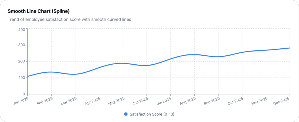 Smooth line chart digambarkan dengan garis lengkung atau kurva halus. Sepintas terlihat seperti line chart dengan garis diagonal pada umumnya. Namun tipe seperti ini ditujukan untuk menujukkan tampilan data yang lebih halus untuk dataset yang fluktuatif dan cenderung kasar sehingga penggunaan garis halus ini dapat membuatnya lebih readible.