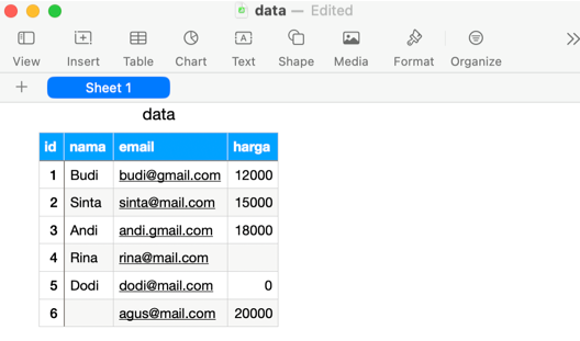 Buat file data.csv di folder proyek Anda. Kita akan memvalidasi Nama (tidak boleh kosong), Email (format), dan Harga (numerik positif).