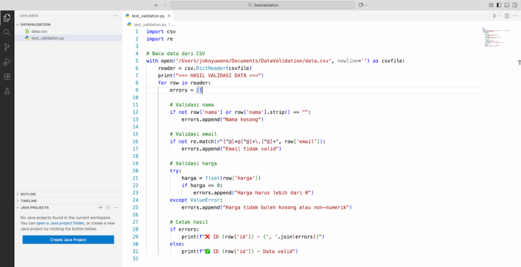 - Menerapkan skrip Python dalam melakukan validasi data CSV.