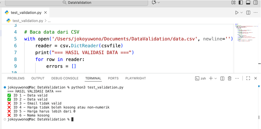 Laporan validasi ini adalah hasil dari skrip Python (test_validation.py) yang memproses setiap baris dari file CSV Anda untuk memastikan integritas data. Skrip memeriksa tiga aturan penting: format Email, keberadaan Nama, dan Harga harus berupa angka positif.